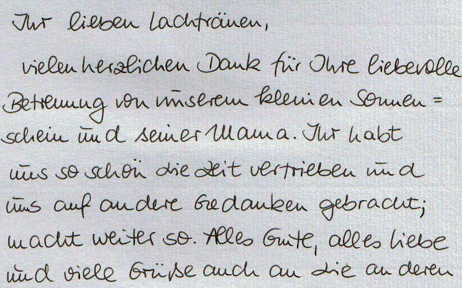 Hier können Sie Fotos, gemalte Bilder oder sonstige Schreiben sehen, die die Kinder oder Eltern, den Klinikclowns Lachtänen zur Veröffentlichung zugeschickt haben.